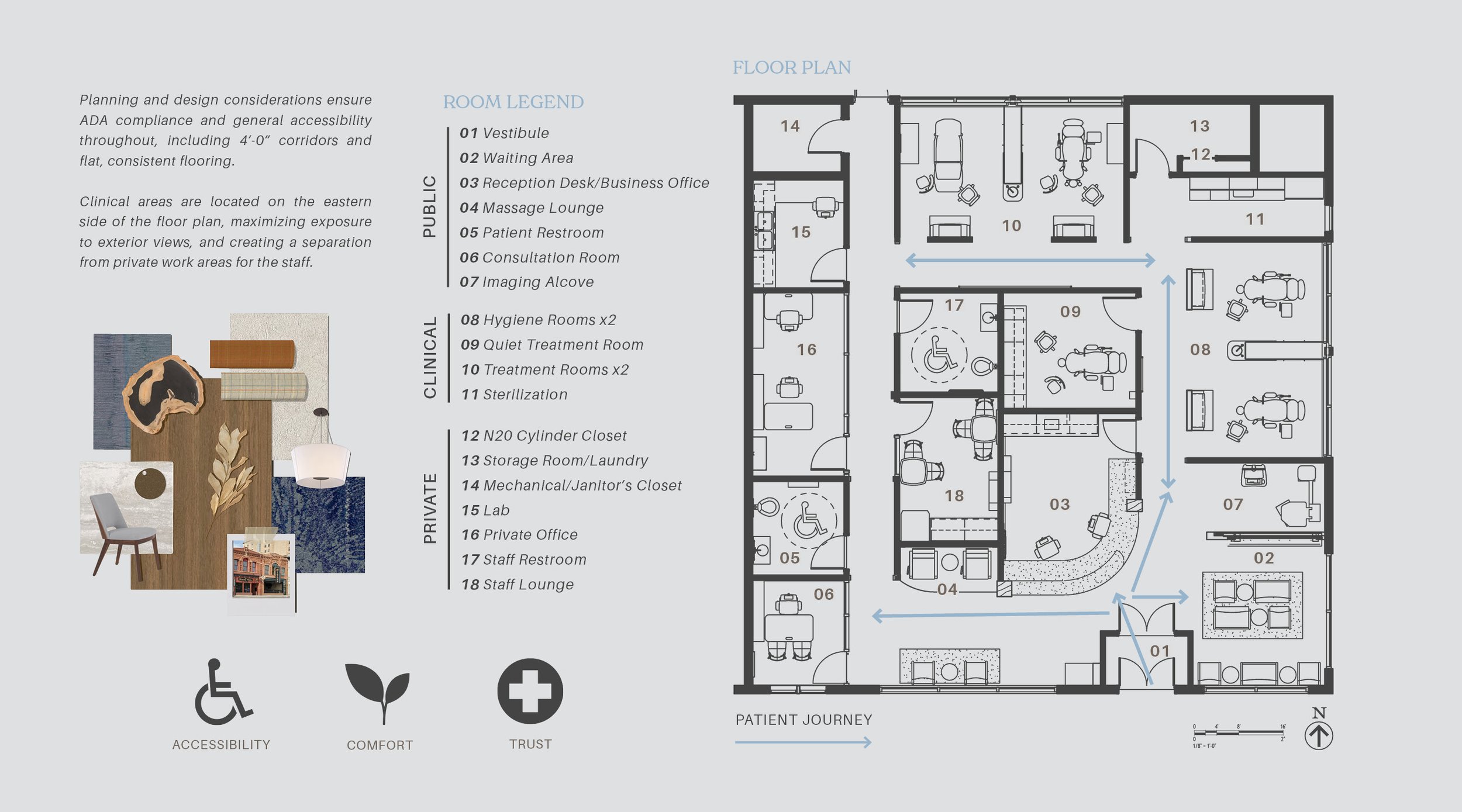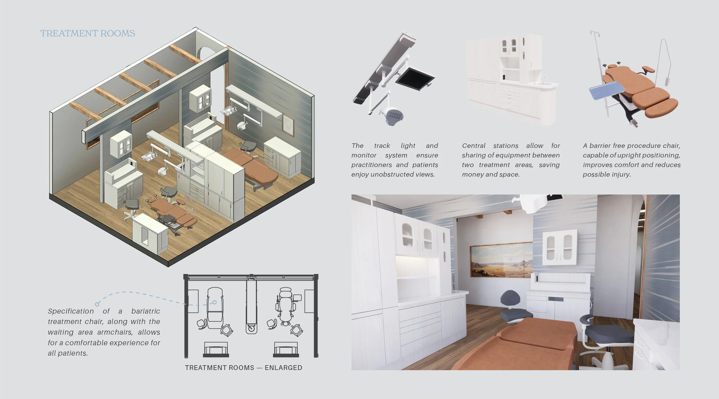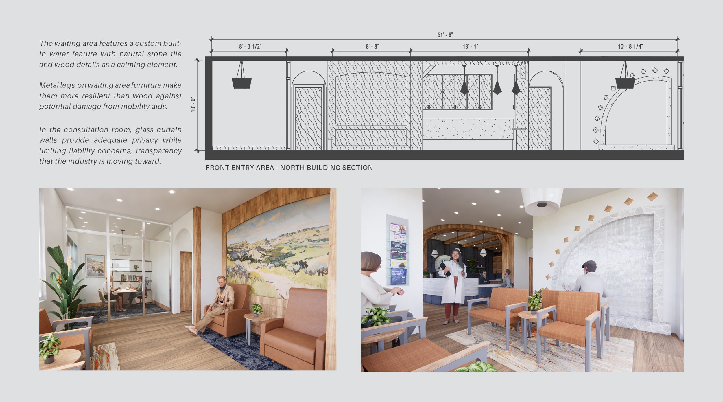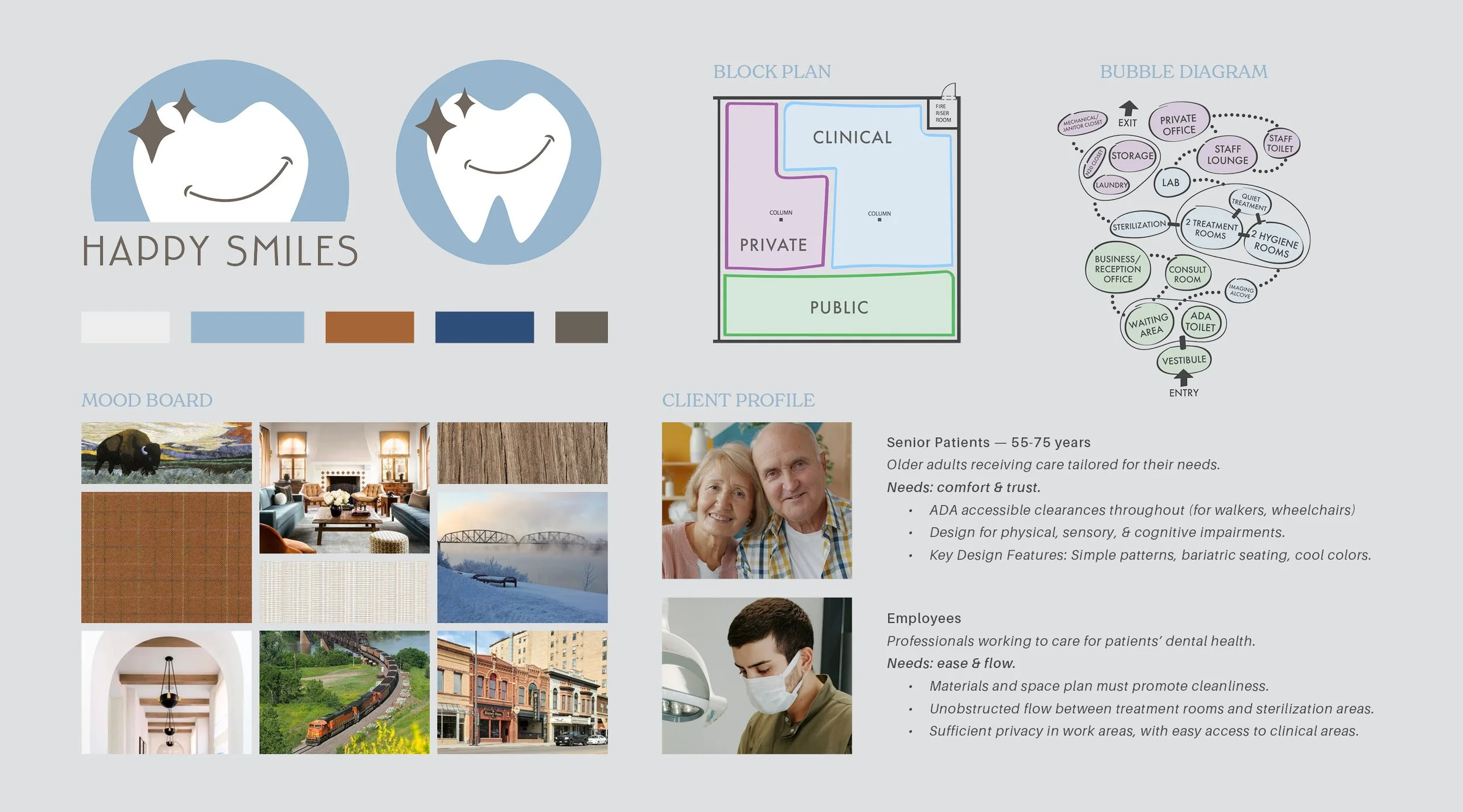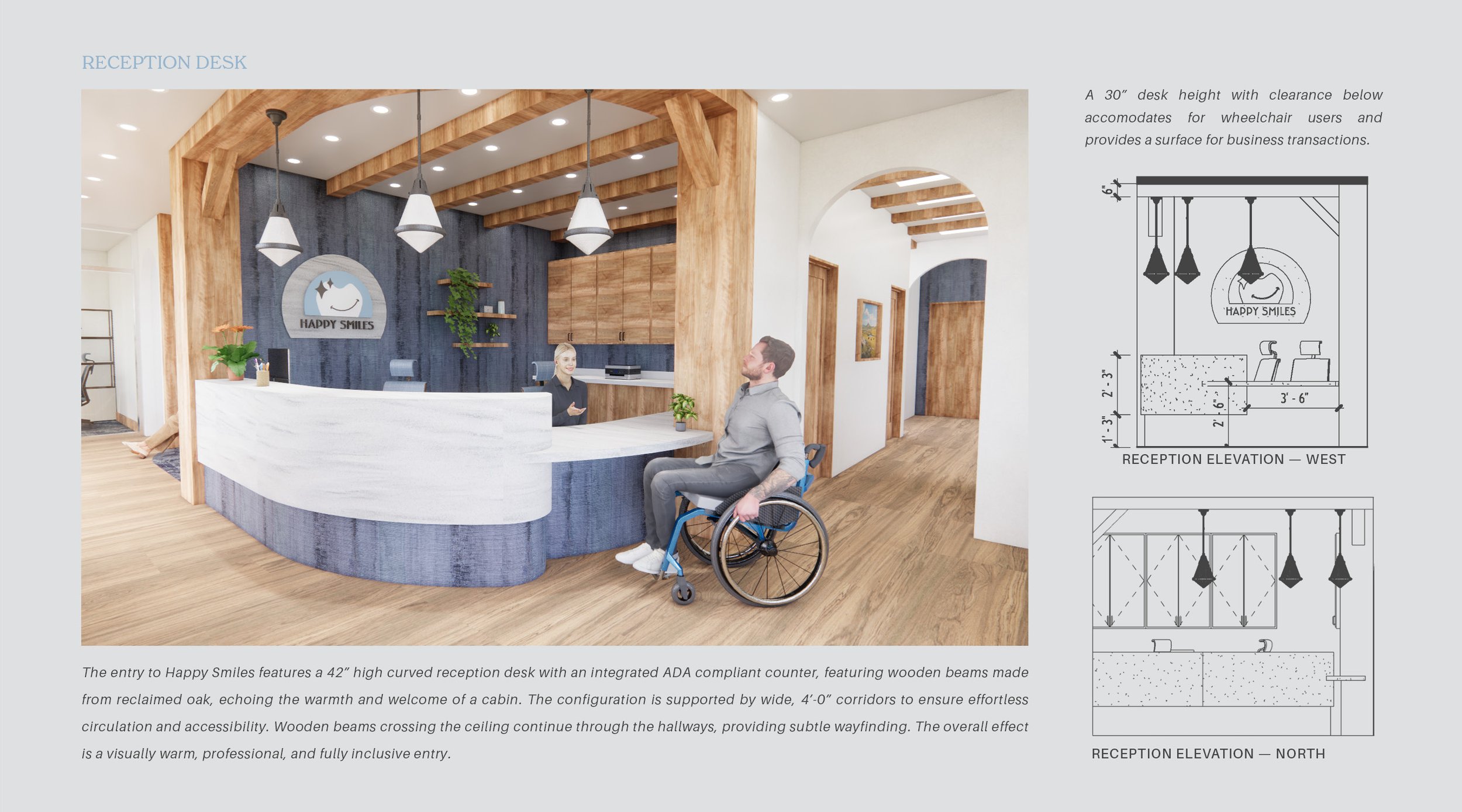Happy Smiles is a small dental clinic in Bismarck, ND that specializes in care for the local senior community. Inspired by the rugged, natural beauty of the region, the space blends rustic charm with modern comfort—creating a serene retreat as much as a trusted medical practice. Thoughtful accessibility features ensure ease and comfort for all patients, while the warm, inviting atmosphere fosters a sense of trust, calm, and safety throughout their visit.